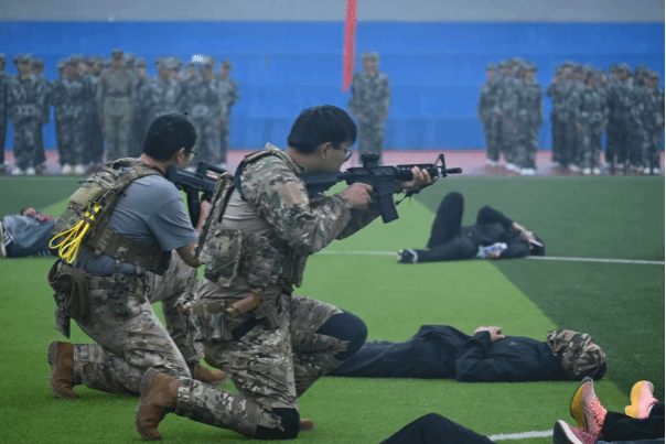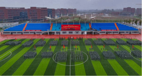 在庄严的国歌声中,开学典礼拉开帷幕。军训成果汇报表演环节精彩纷呈,学校军事兴趣社团带来了2025“护盾”演习,新生们也展示了军体拳、匕首操和分列式表演,充分展现了军训的